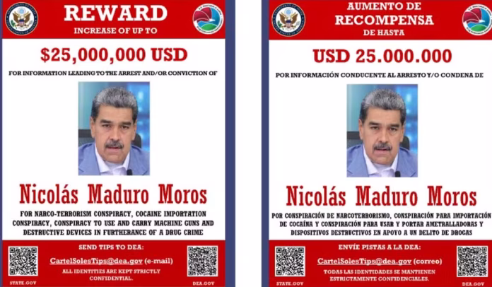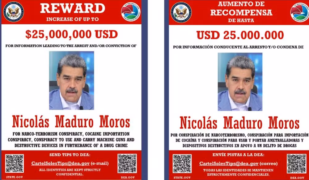 O Departamento da Justiça dos Estados Unidos divulgou na segunda-feira (28) uma recompensa de US$ 25 milhões (cerca de R$ 140 milhões) para quem tiver informações “que levem à prisão e/ou condenação” de Nicolás Maduro, presidente da Venezuela.
